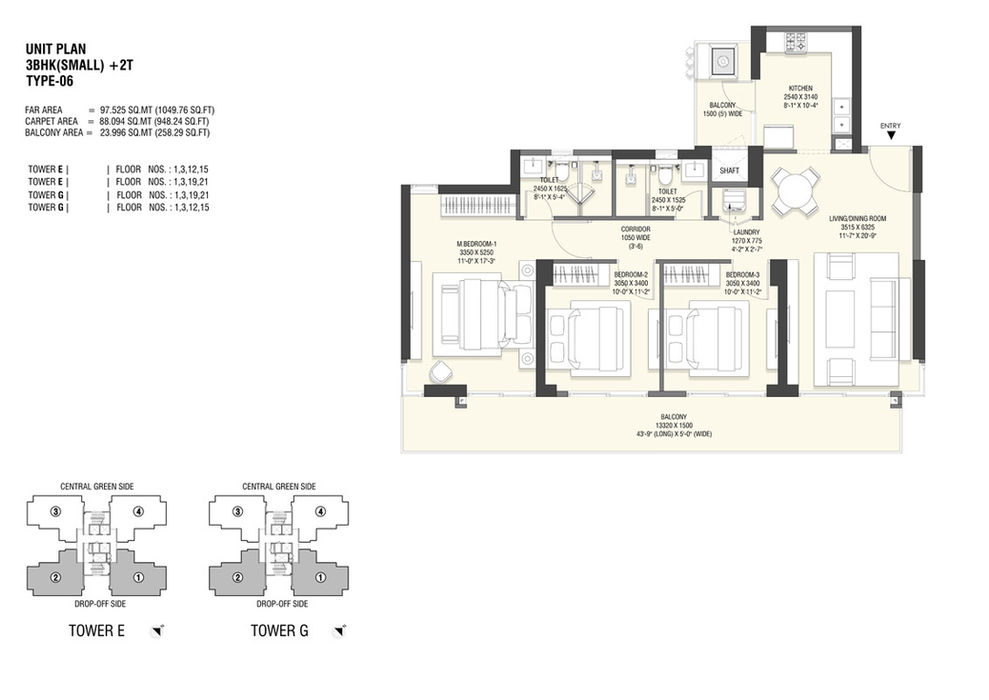 Offering 3 and 4 BHK apartments with multiple size configurations.